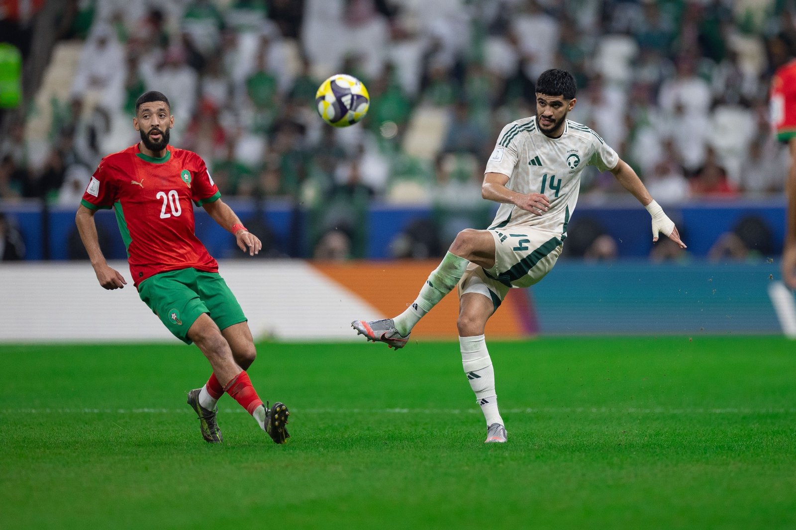 شهدت المباراة أيضًا محاولات قوية من المنتخب السعودي، أبرزها رأسية صالح أبو الشامات بعد عرضية رائعة من مراد هوساوي، لكنها اصطدمت بعارضة مرمى المغرب وعادت للملعب.